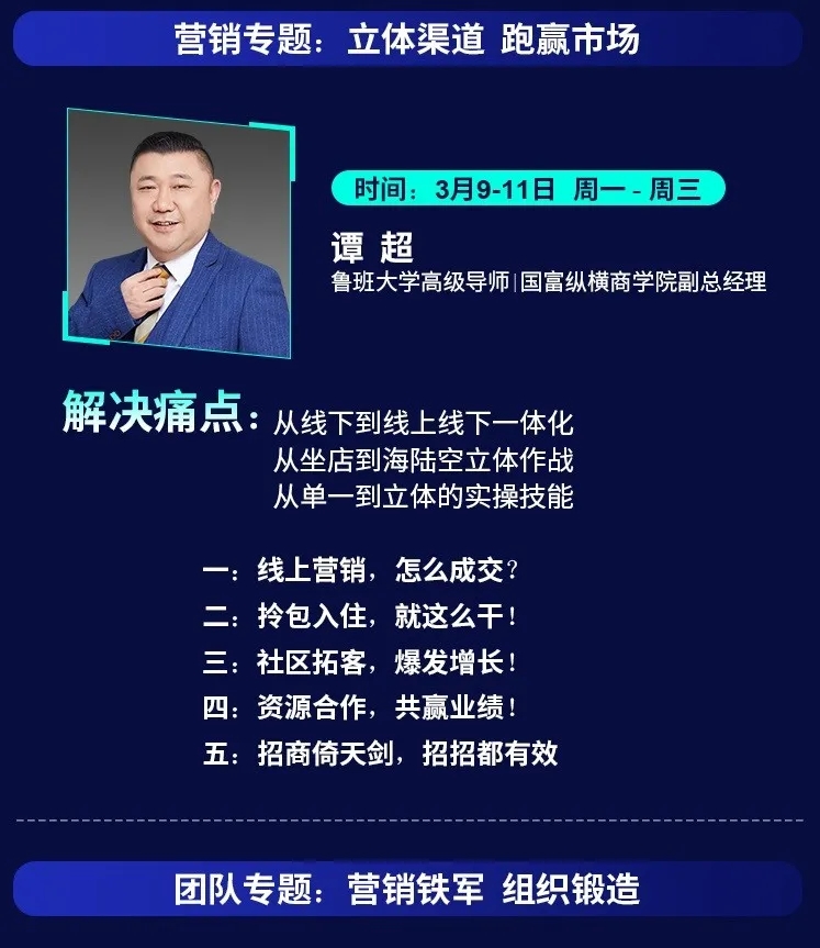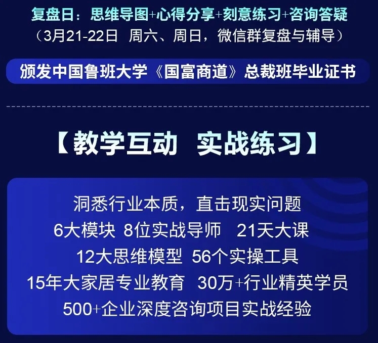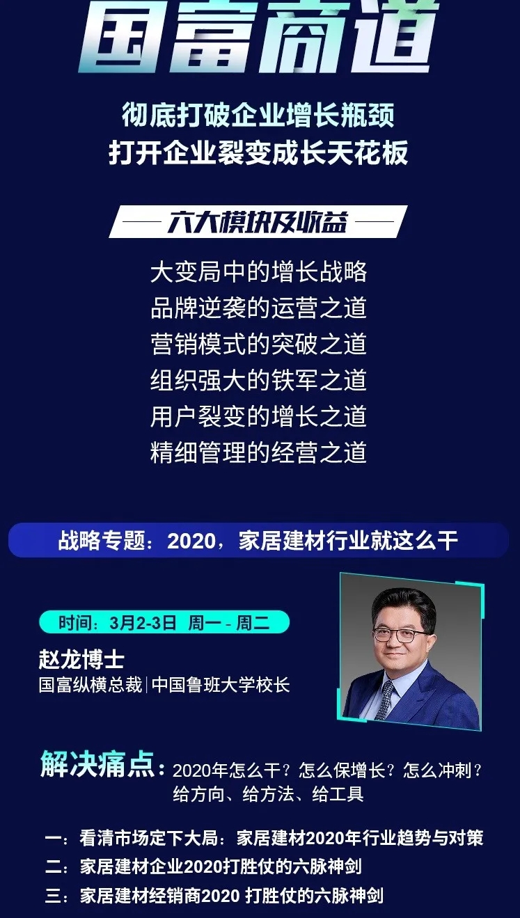 為了幫助家居企業在2020年逆勢突圍,中國魯班大學&國富縱橫重磅推出年度大課——《國富商道》,這是一堂2020家居建材老板必上的增長課,專門針對經銷商老板、中高管和生產企業老板、中高管的專屬課程。自3月2日起至3月22日,中國魯班大學&國富縱橫將通過21天的直播大課為您帶來大變局中的增長戰略,品牌逆勢的運營之道、營銷模式的突破之道、組織強大的鐵軍之道、用戶裂變的增長之道、精細管理的經營之道,一切精彩盡在中國大家居教育平臺,敬請期待!